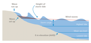 Coastal Inundation: Caused by high tides (sea level), storm surge and wave runup and is worst when they occur together.